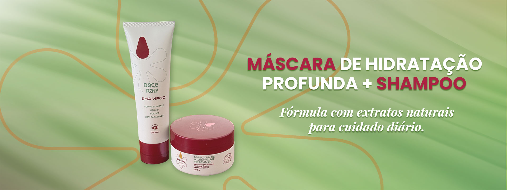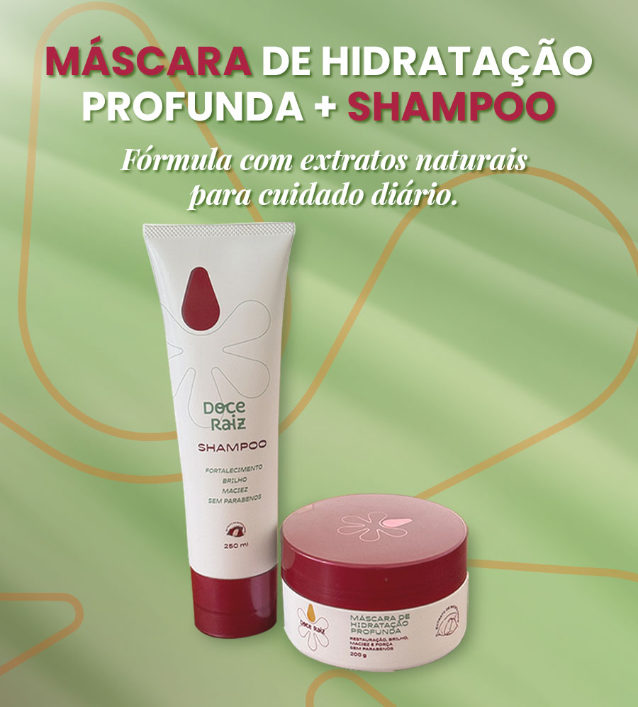 Kit Mascara e Shampoo Doce Raiz de Extrato de Batata Doce para MaciezPor R$ 81,90 De R$ 91,90O Kit Doce Raiz une o Shampoo e a Máscara de Hidratação Profunda com Extrato de Batata Doce para um cuidado completo dos cabelos. Juntos, limpam, restauram e fortalecem os fios, proporcionando brilho, maciez e vitalidade natural, sem parabenos.